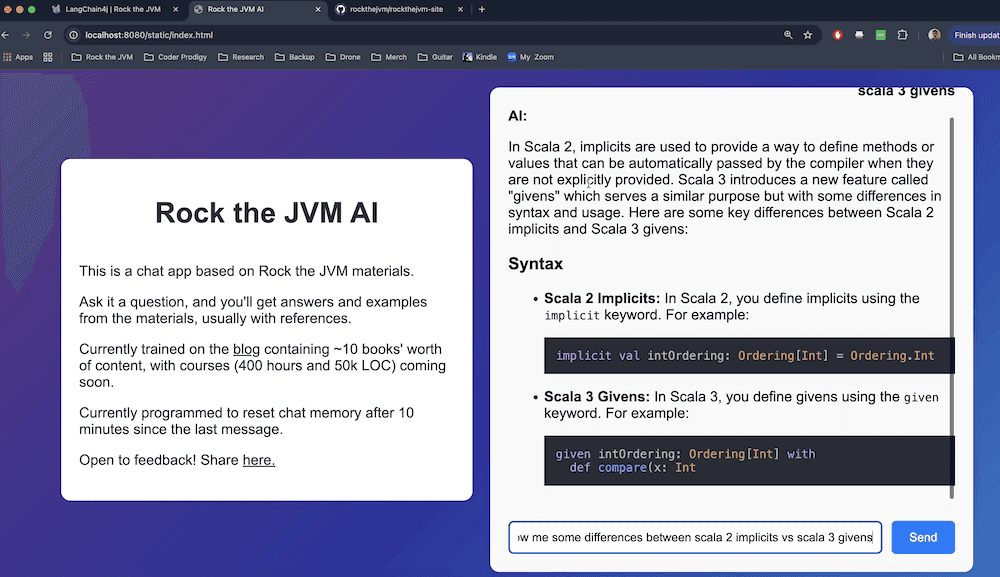 This is an AI chatbot trained on my own blog on camera. It’s able to give you contextualized answers with code examples and references where it found the information.