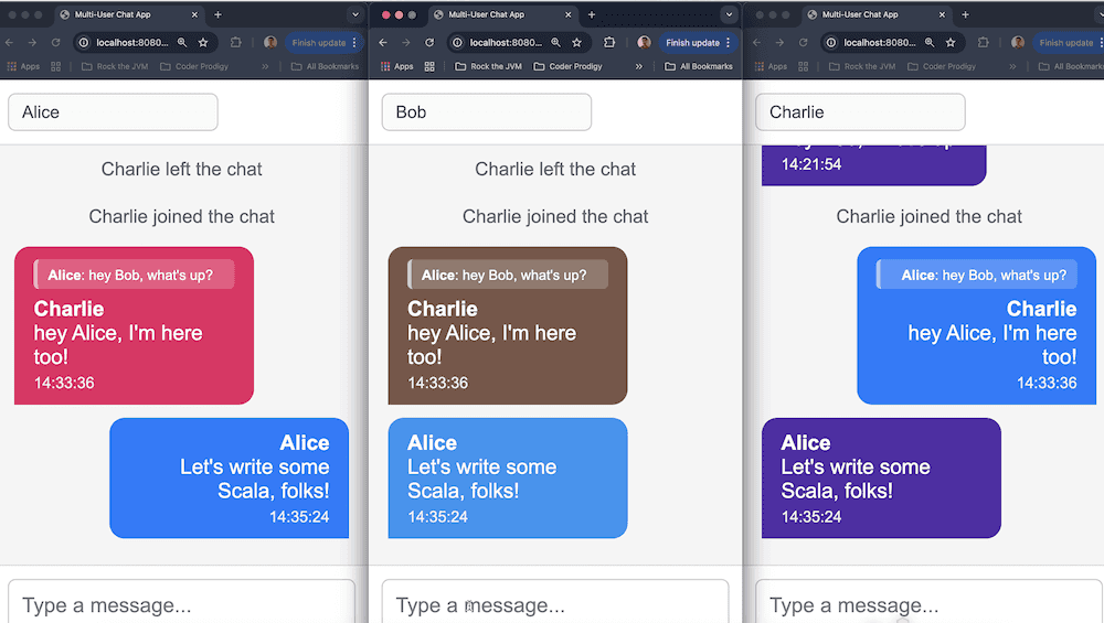 This is a full-stack Scala application in the style of WhatsApp. Multiple users can connect to a chat room, and send messages and replies, with persistent storage. When a user logs in, they see the full chat history.
