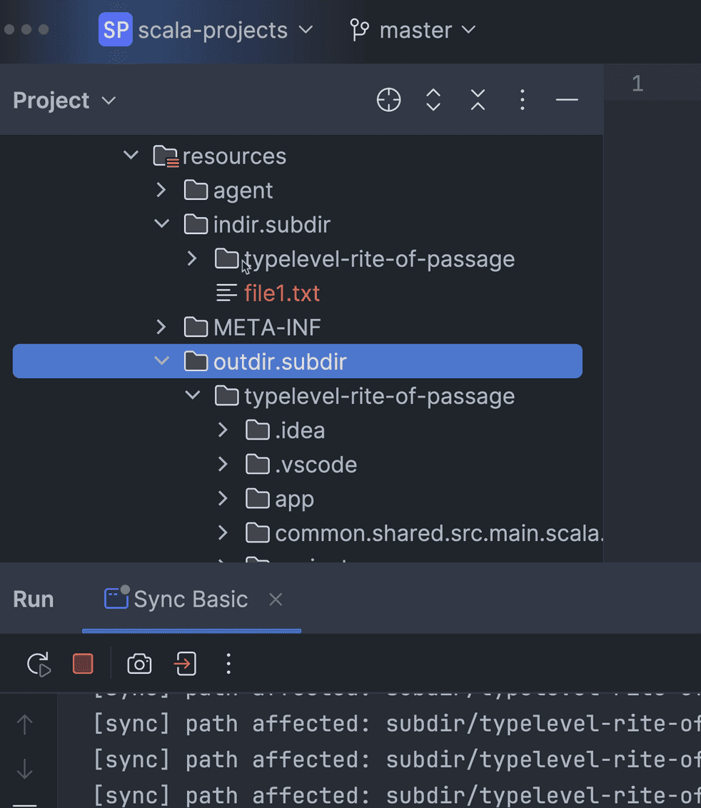 This is a real-time file synchronizer. Works real fast: I try cloning my big Typelevel Rite of Passage repo on camera and it’s instantly mirrored on the other side. The screenshot doesn’t do it justic: I’m cloning the repo in indir and it’s instantly mirrored in outdir.